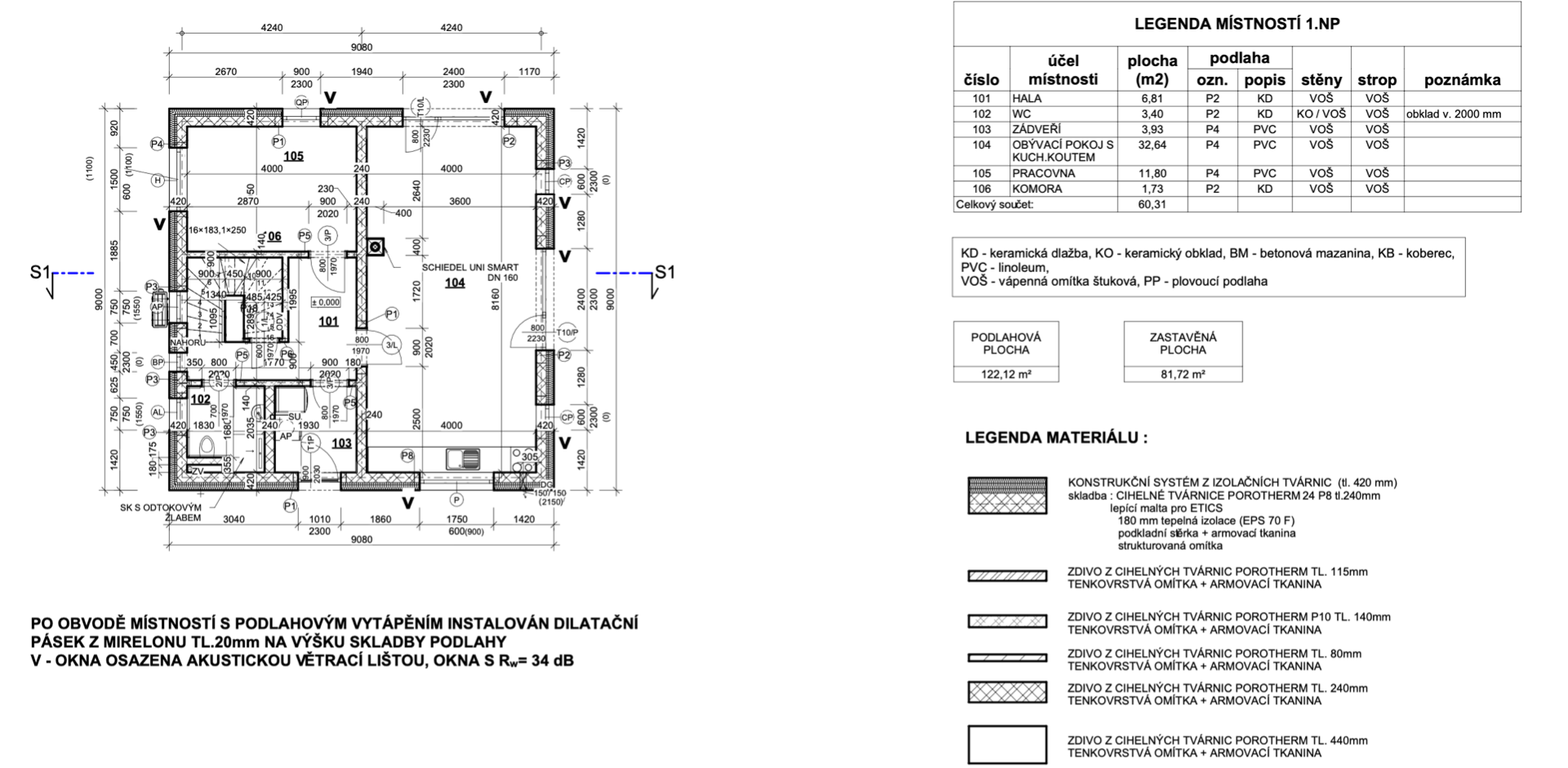 Dispozice 5+1 nabízí užitnou plochu 122 m². Bohatý vnitřní prostor zahrnuje v přízemí obývací pokoj spojený s kuchyňským koutem, dále pokoj pro hosty nebo pracovnu, zádveří, předsíň, koupelnou se sprchovým koutem a WC, komoru. Po pohodlném dvouramenném betonovém schodišti vystoupáte do 2. patra, kde se nachází ložnice a 2 dětské pokoje, samostatná koupelna s rohovou vanou a WC. Z části galerie může být např. šatna. Standardně je dům vybaven tepelným čerpadlem s podlahovým vytápěním, krbovým komínem, závěsnými WC, rohovou vanou, hromosvodem a podlahovými krytinami ve variantě vinylu nebo keramické dlažby.